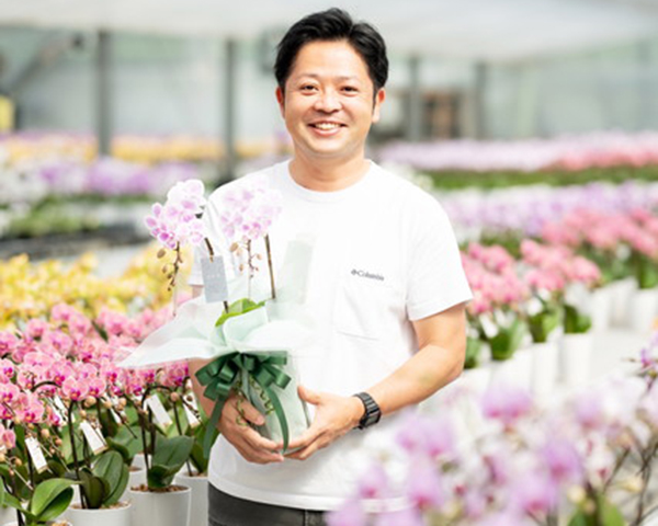 現在ではミディ胡蝶蘭というコンパクトな胡蝶蘭を専門に生産・販売しており、一般家庭でも気軽に飾れる胡蝶蘭を主に企画・提案をしております。